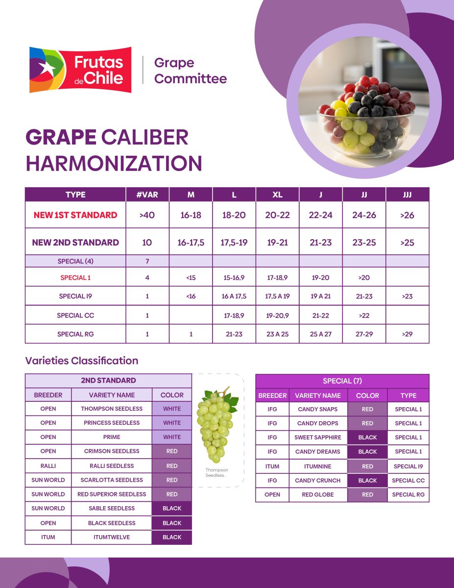 La propuesta busca ordenar la información que se entrega a los mercados, ya que en la actualidad existen más de 63 variedades de uvas de mesa en Chile, con 46 rangos de calibres y 5 diferentes escalas de nomenclatura, en una paleta donde conviven medidas desde la S a la XL, mientras que otros usan desde la A a la J.