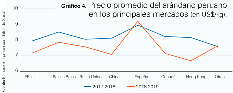 Para el 2017 decidieron ya no exportar a Norteamérica porque con el poco volumen que tenían optaron por priorizar mercados que no conocían, y ese era China, decidiendo exportar allí por dos motivos: “Primero, porque no lo conocían. Necesitában conocerlo sí o sí y querían hacer todo el volumen de arándano posible para desarrollar ese mercado. Segundo, porque tienen una fruta de calidad superior, con mejor vida de anaquel, mejor sabor, mejor ‘bloom’…”. El primer envío a China fueron siete contenedores y ya en 2018 habían triplicado sus exportaciones al gigante asiático. “Participamos de la feria Asia Fruit Logistica con stand y fuimos decididos a posicionar nuestra marca, resaltando la característica de que es el único arándano en las montañas nevadas del Perú. Todo eso llevamos a Asia y nos permitió ir haciendo camino”. Así es como en 2019 ya enviaron unos 50 contenedores, representando el mercado asiático el 40% de toda la exportación de la empresa. El objetivo es ir ganando cuota de mercado en China. Mientras eso ocurre, la firma continuó enviando a Europa, mercado al que en la pasada campaña abasteció con el 55 % de su producción y a Norteamérica, donde enviamos el 5% de la fruta que se produjo en esta campaña 2019.