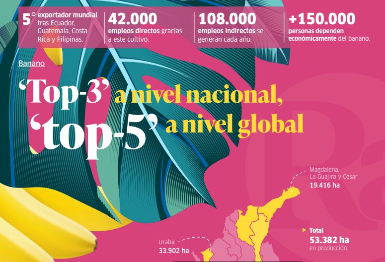 Pequeños, medianos y grandes productores han construido una robusta industria del banano que hoy tiene a Colombia como el cuarto exportador a nivel global. Se trata de una fruta altamente competitiva y de un alto valor agregado que, debe hacer frente a una serie de retos para seguir manteniendo esa posición ante consumidores que cada vez son más exigentes.