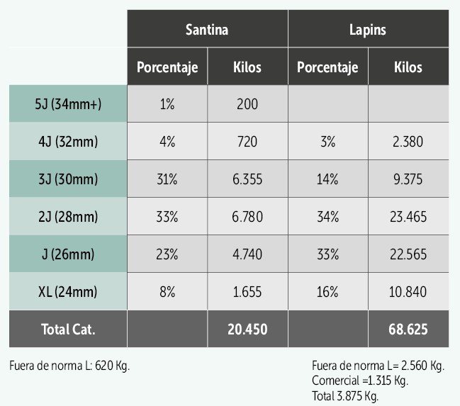 Resultados en Cerezos en un campo en Paine, con cosecha promedio de 18.000 kilos por hectárea. Se entregaron 93.570 kilos para analizar la distribución de calibre a una reconocida exportadora.
