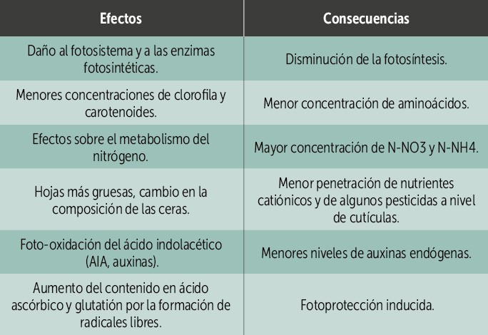 La intensidad de la radiación ultravioleta afecta negativamente a los cultivos agrícolas. Los índices UVI (ultravioleta) sobre 8 disminuyen la capacidad de hacer fotosíntesis de las plantas, entrando éstas a un estado de déficit energético. Además, altos valores de RUV (radiación ultravioleta) aumentan la producción de radicales libres: especies reactivas al oxígeno (ROS) y especies reactivas al nitrógeno (RNS). O sea “se produce ‘basura’ a nivel celular”. Con alta radiación UVB ocurre la oxidación de los aminoácidos (tirosina, fenilalanina y triptófano). Además, hay oxidación del ácido indolacético (AIA).