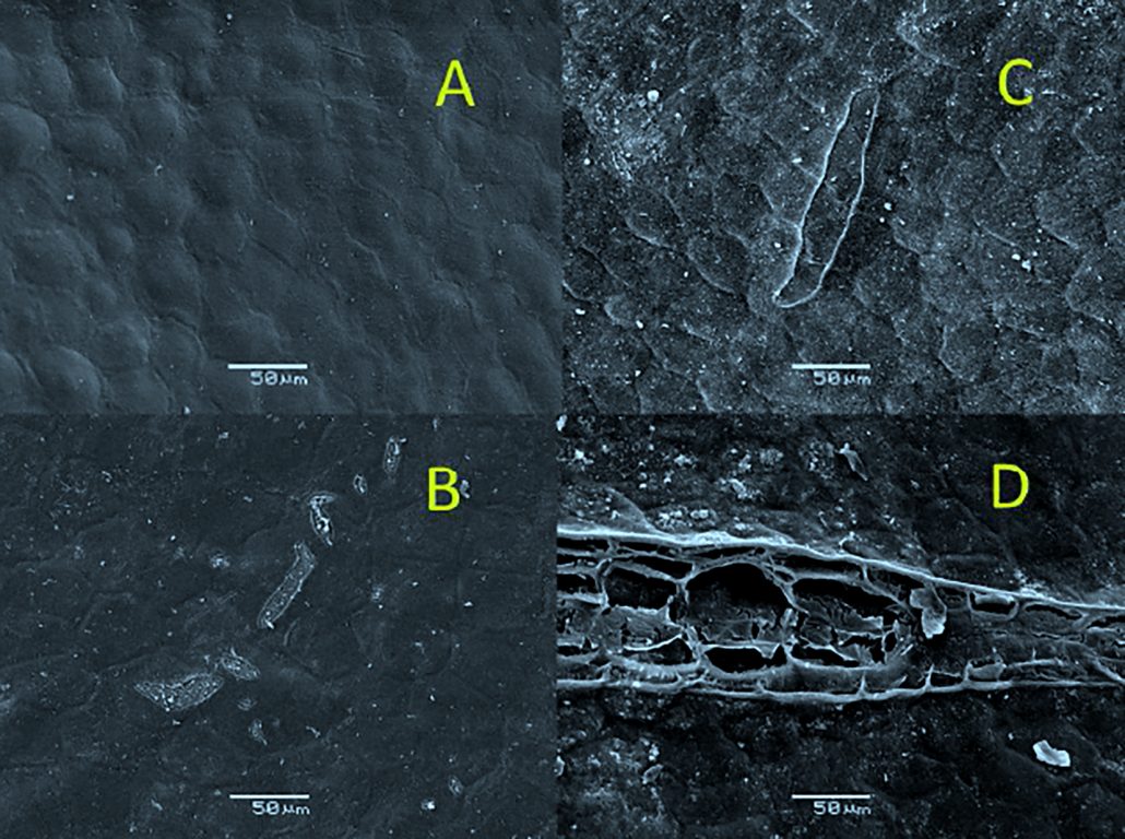 En la figura 1. Aspecto visual de micro-fracturas de la cutícula en frutos sometidos al tratamiento con Biotens (a y b) y no tratados (c y d). Las imágenes de arriba corresponden a la zona distal del fruto, mientras que la de abajo a la zona pedicelar. Los frutos tratados con Biotens, presentan la formación de una película que le otorga una mayor integridad a la cutícula (foto 4a y 4b).