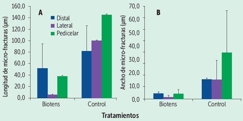 En la figura 2 podemos apreciar que tanto la longitud como el ancho de microfracturas de la cutícula fue reducida con la aplicación de Biotens, cuyas diferencias se observaron tanto en la zona distal, pedicelar como lateral de la fruta.