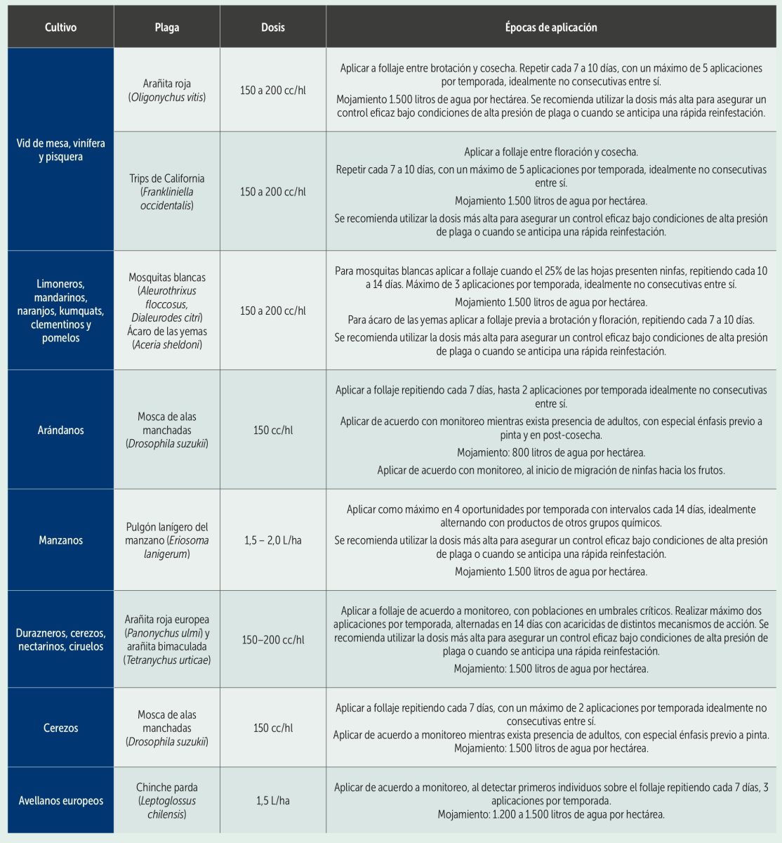que es de mínimo 4 horas. Es así que puede ser posicionado tanto en plena floración como en precosecha en vides, para el manejo de trips, con un máximo de 5 aplicaciones por temporada, reforzando el manejo con herramientas complementarias.