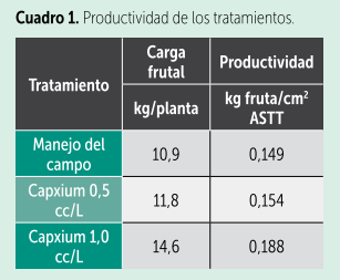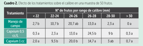El estudio demostró que la dosis de 1 cc/L logró una mayor productividad (cuadro 1), manteniendo el calibre obtenido con el manejo convencional del campo. En tanto, la dosis de 0,5 cc/L mostró una mejora significativa en el calibre respecto del control (cuadro 2).