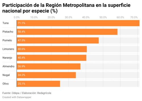 Adicionalmente, en la misma línea de participación frutal a nivel regional, el catastro permite observar el rasgo relevante de la alta concentración que la Región Metropolitana presenta a nivel nacional en determinadas especies. Esto se expresa con especial fuerza en cítricos como limonero, naranjo y pomelo, así como en frutos secos y oleaginosas. Incluso en cultivos de menor superficie total, como la tuna o el pistacho, el peso relativo de la región resulta determinante al observarlo a nivel nacional.