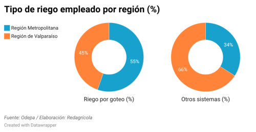 Mientras en la Región Metropolitana predomina ampliamente el riego por goteo, en Valparaíso se combinan distintos sistemas, destacando el uso de microaspersión en el cultivo del palto.