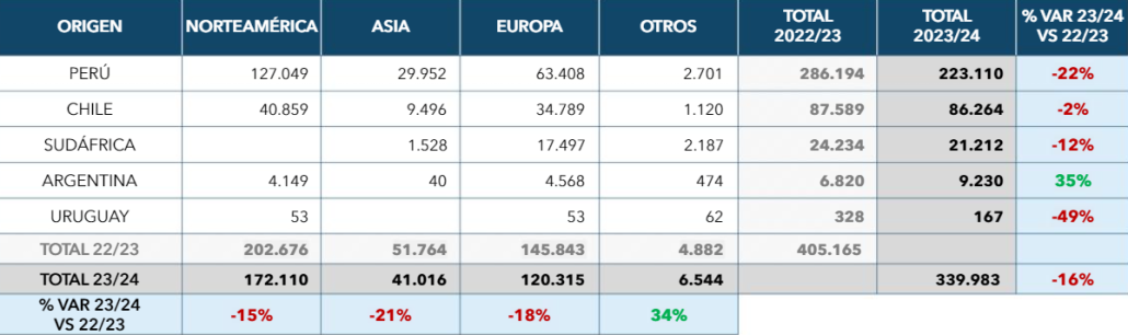 Durante la temporada 2023/24, los países del hemisferio sur, junto con México y Marruecos -dos de los ‘nuevos jugadores’ del hemisferio norte-, exportaron un volumen total de 465.230 toneladas, marcando una disminución del 15% en comparación con la temporada anterior, que había alcanzado un volumen récord donde superó las 550.000 toneladas.