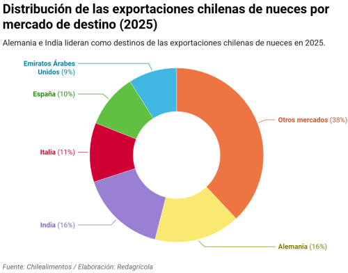 Durante 2025, los envíos de nueces mantuvieron una distribución concentrada en algunos mercados clave, con Alemania y la India como principales destinos.