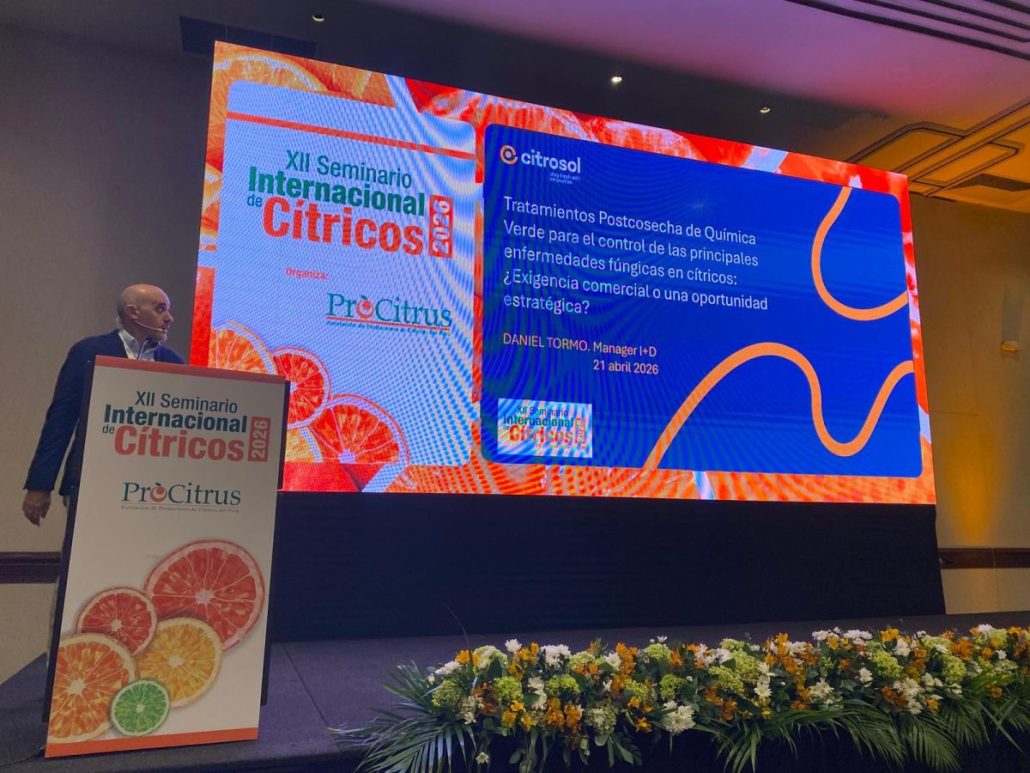 Citrosol participó a su vez con dos presentaciones a cargo de Daniel Tormo, Manager de I+D en la empresa. La primera de ellas estuvo titulada “Tratamientos Postcosecha de Química Verde para el control de las principales enfermedades fúngicas en cítricos: ¿Exigencia comercial o una oportunidad estratégica?”.