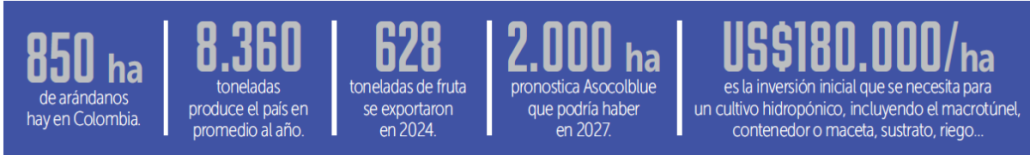 El arándano en Colombia, al contrario de lo que ha pasado con otras especies frutícolas, ha tenido un desarrollo tímido y casi silencioso. Su crecimiento ha estado ligado a empresas dedicadas a la producción de flores, quienes han visto en esta baya de color azul como una nueva alternativa productiva, pero también a productores (e inversores) que han decidido aventurarse en un cultivo que tiene al propio país como su principal mercado de destino.