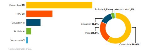 De acuerdo con el mapeo realizado, con el que se busca impulsar el desarrollo de este tipo de empresas de base tecnológica y el uso de sus aplicaciones e innovaciones en los sistemas agroalimentarios de los países andinos, se identificaron unas 90 empresas del sector agtech con origen en esta región. Colombia está a la cabeza, con 53 agtech (59% del total) ; seguida por Perú con 21 (23%),  Ecuador con 11 (12%), Bolivia, con 4 (4,5%) y Venezuela, con una sola agtech (1,1%).