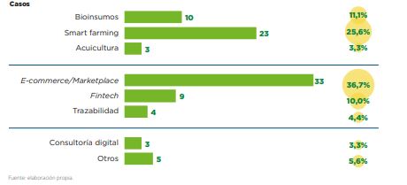 Dentro de las 90 agtechs identificadas, el BID y el IICA señalan que se evidencia un amplio abanico de soluciones, en cuya oferta predominan plataformas para el comercio digital (36,7%), aplicaciones e instrumental para agricultura inteligente o de precisión (25,6%) y bioinsumos (11,1%).