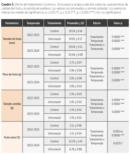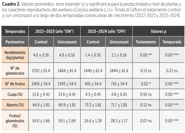 En resumen, la aplicación de UCZ en avellano europeo variedad ‘Tonda di Giffoni’ ha demostrado ser una estrategia eficaz para controlar el vigor vegetativo, aumentando la floración, mejorando el rendimiento e incrementando la calidad final del fruto, particularmente en años de baja producción.