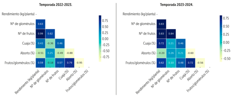 Esto indica que en un año de alta producción el rendimiento se explica principalmente por la cantidad de estructuras reproductivas disponibles, es decir, glomérulos y la fructificación inicial. Por otro lado, en el año “Off” 2023–2024, con cargas naturalmente bajas, cambió el panorama de correlaciones destacando el papel crítico de retención y floración.