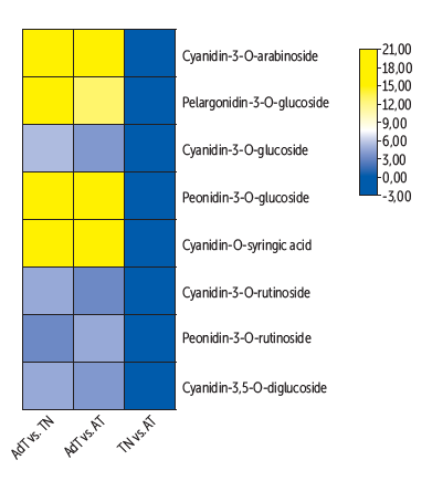 En los DAMs, la mayoría de los lípidos y flavonoides son más abundantes a temperatura normal (TN), en tanto que la mayoría de los ácidos fenólicos y alcaloides son más abundantes a alta temperatura (AT). Entre los metabolitos detectados, se identificó a 21 como monómeros de antocianinas, 8 de los cuales eran significativamente menos abundantes en AT que en TN.