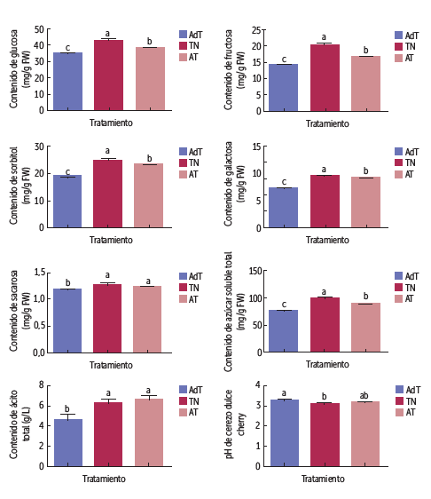 Análisis más acuciosos mostraron diferencias principalmente en glucosa, fructosa, sorbitol y galactosa. El contenido de las 4 azúcares fue de 10,04%, 16,83%, y 3,40% más bajo en AT que en TN, respectivamente. Por su parte, la sacarosa no representó más del 2% de los SST y no mostró diferencias significativas entre los tratamientos. No se encontraron diferencias entre el contenido de ácido total o pH entre los tratamientos.