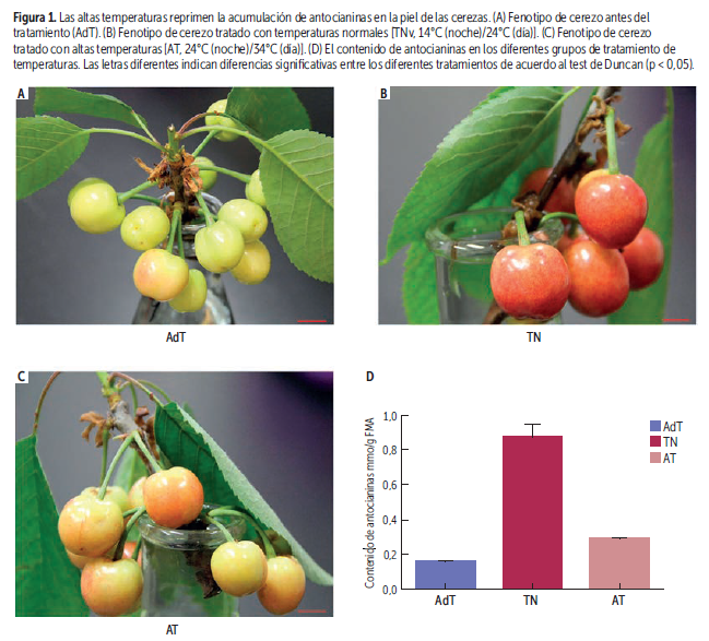 Estos hallazgos sugieren que el ABA es un regulador clave en la inhibición de la coloración de la cereza ante elevadas temperaturas. Tratamientos con ABA pueden incidir significativamente en la acumulación de antocianinas en la fruta de cerezo, en tanto que tratamientos con inhibidores de biosíntesis de ABA bloquean la producción de estos pigmentos (Ren and Leng, 2010; Shen et al., 2014).