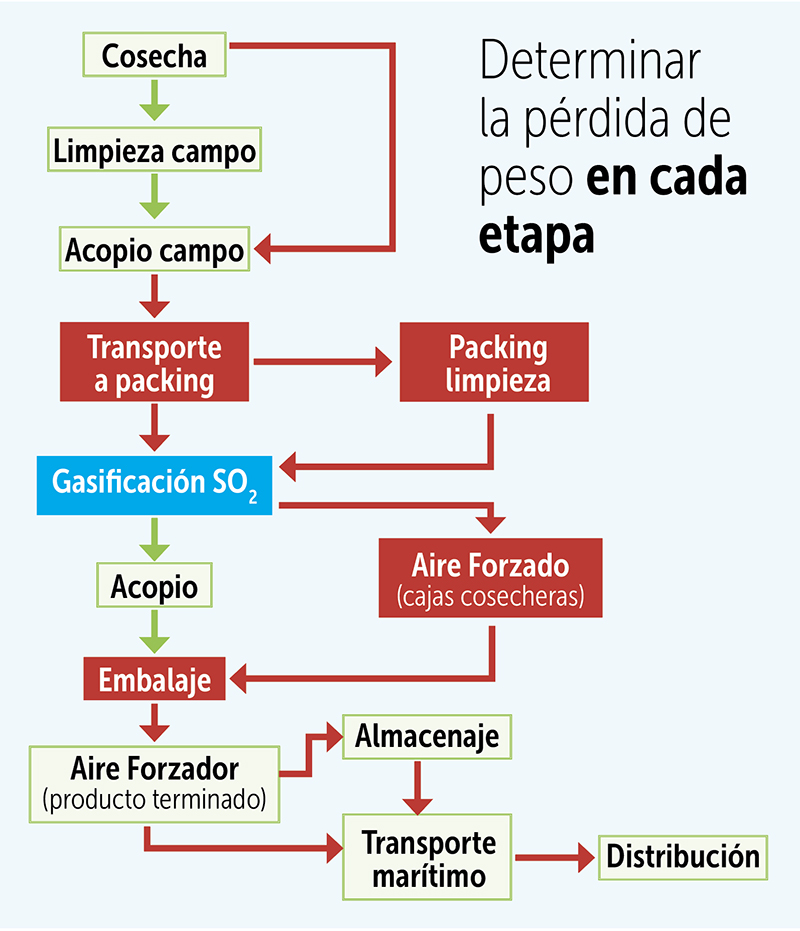 15. Determinar la pérdida de peso: De la misma forma, es importante determinar la pérdida de peso en cada etapa. Y ello se realiza con corridas completas de cajas, usando una balanza de campo calibrada: peso inicial y luego peso en cada hora hasta completar el tiempo máximo que se tarda la fruta en cada etapa. Las etapas donde se da una mayor deshidratación son la cosecha, la limpieza en campo, el acopio, enfriamiento por aire forzado, almacenaje, transporte marítimo y distribución. Luchsinger explica que, aunque con un packing americano se puede ‘bajar mucho’ la pérdida de peso en las primeras etapas, aún quedan las etapas de aire forzado, almacenaje y transporte.