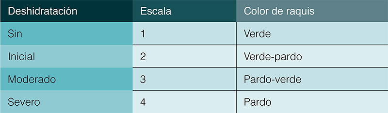 14. Determinar el potencial de deshidratación: El especialista remarca que es necesario que tanto los productores como los exportadores de uva de mesa conozcan el potencial de deshidratación del racimo, es decir, deben calcular cuánto peso puede perder la uva de mesa a partir de la cosecha, sin afectar su apariencia. “En fruta recién cosechada, tomo el peso del racimo dentro de un clamshell (repito esto en 4 racimos), los mantengo en un lugar a temperatura ambiente, y todos los días los peso y le coloco una nota (ver cuadro 1) al pedicelo y al hombro/lateral del raquis. Cuando llego a nota 3 (deshidratación moderada), vale decir cuando el pedicelo tiene un color mayoritariamente pardo, pero le queda algo de verde, o nota 2 en el hombro/lateral del raquis, vale decir que la mayoría es verde pero han aparecido tonalidades pardas, destaro y determino el % de pérdida de peso. Ese sería el potencial de deshidratación”, explica Luchsinger.