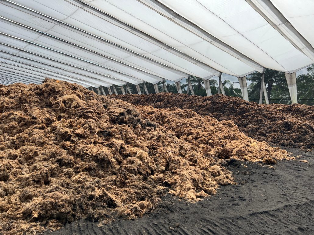 El ingeniero Sergio Gamboa, líder de sostenibilidad de la compañía, comenta que, en este espacio cubierto con una superficie de aproximadamente 28.440 metros cuadrados se recibe toda la biomasa proveniente de la fruta que llega a la planta de beneficio, tanto propia como de palmicultores aliados.