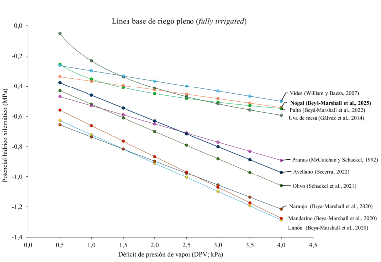 Allí definimos líneas base de potencial hídrico xilemático (Ψx) en función del déficit de presión de vapor (DPV), que permiten interpretar de manera más confiable el estado hídrico del huerto.