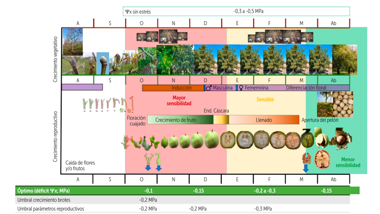 El nogal no responde igual al déficit hídrico durante toda la temporada, hay etapas más sensibles en las que un mal manejo del agua y/o sales puede comprometer calibre, rendimiento e incluso la producción del año siguiente (Lobos, 2020, Calvo et al., 2022; Beyá-Marshall et al., 2024):
