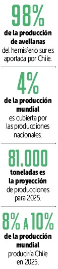 El avellano europeo cuenta con 32.000 hectáreas (ha) plantadas desde la región del Maule al sur de la región de Los Lagos.