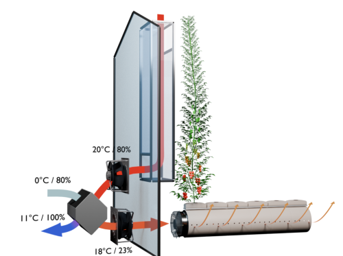 Fabien Cuq, de Airgaïa, fabricante de EXT’air da un ejemplo: “un aire que tiene 20°C y 80% de humedad para tomate, algo típico, se cruza con un aire a 0°c y 80% al exterior. El aire mezclado a través de Ext’air entra a 18°c y 23% de humedad”.