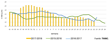 – Cuando uno analiza el precio promedio del arándano, este ha bajado un dólar por año, desde hace cuatro años. La campaña pasada el promedio fue de unos US$7.5/kg, mientras que un año antes había sido de US$8.5/kg. Este año ya estamos en US$6.5/ha, como promedio.