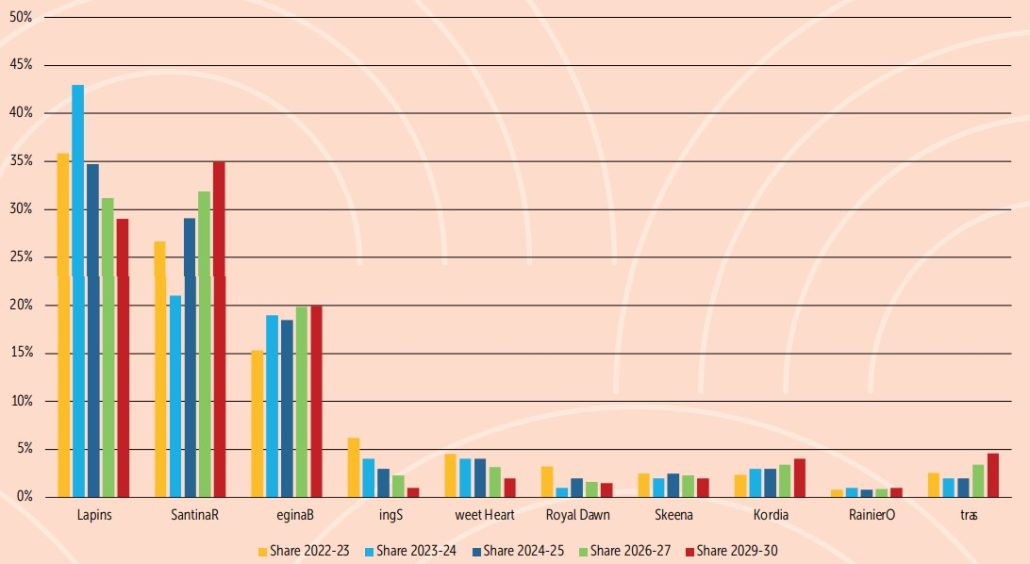 -Proporcionalmente, Santina va a aumentar muchísimo más de lo que va a aumentar Lapins respecto a la temporada pasada. Lo que pasará es que la curva de producción partirá antes. Esto traerá cambios. Primero, el valor de Santina en las semanas 49 y 50 tendrá una bajada de precio mucho más rápida. Pero no es un problema de la variedad Santina, sino de la fecha en que se produzca. Antes, el valor de la fruta caía por los volúmenes de Lapins, entre las semanas 50 y 51, ahora tendremos una caída más rápida, con los volúmenes de Santina en la semana 49. Los precios caerán antes porque los volúmenes de Santina serán mucho más altos.