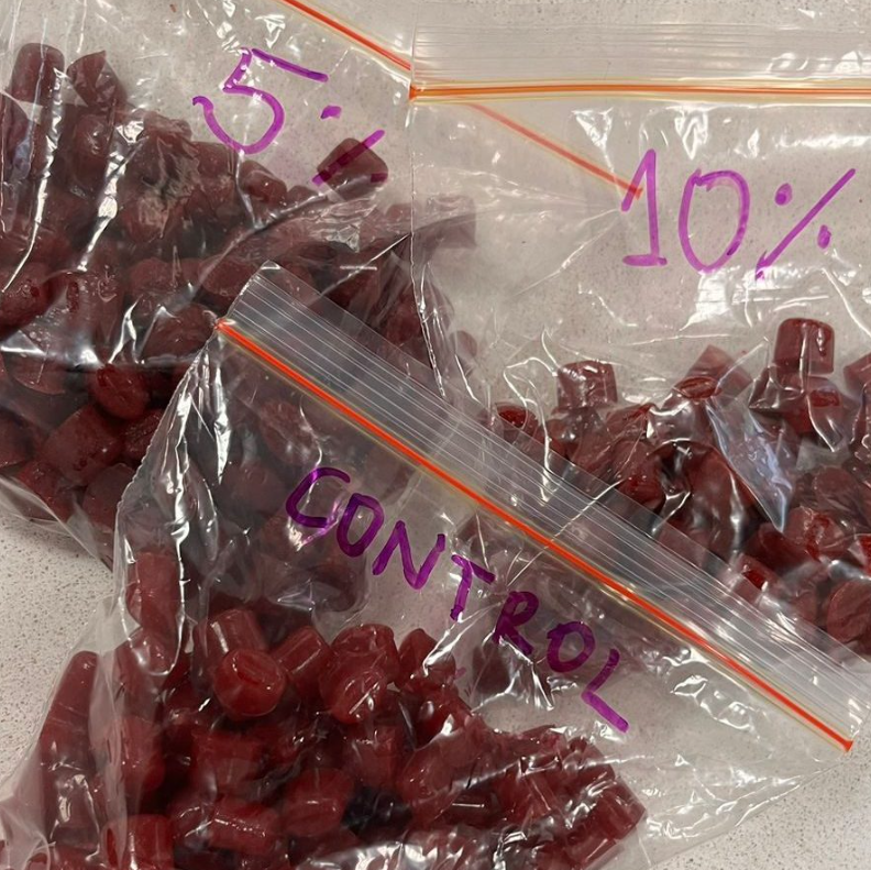 Según el informe, a partir de este extracto se formularon 3 versiones de gomitas: sin extracto (control), con un 5% y con un 10% de ECG. La base de las gomitas incluyó gelatina, alulosa como edulcorante, pulpa de frambuesa y ácido cítrico, buscando que fuera un producto más funcional, atractivo y sin azúcares añadidos.