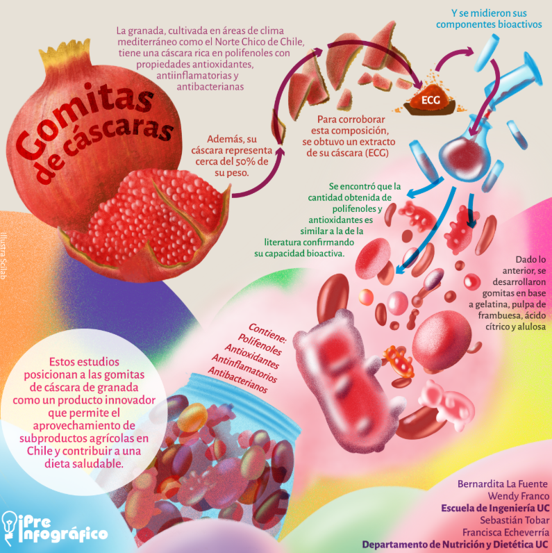 Para más detalles técnicos, te dejamos el artículo original de la Escuela de Ingeniería UC: https://divulgacion.ing.uc.cl/alimentos/gomitas-saludables-a-partir-de-cascaras-de-granada-una-innovacion-sostenible/