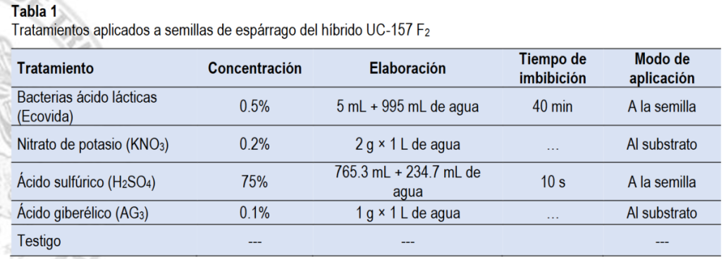 El estudio comparó cuatro tratamientos: bacterias ácido lácticas, nitrato de potasio (KNO₃), ácido sulfúrico (H₂SO₄) y ácido giberélico (AG₃), además de un testigo sin tratamiento. Las pruebas de germinación se realizaron bajo un diseño experimental completamente al azar, utilizando repeticiones de 100 semillas por tratamiento.