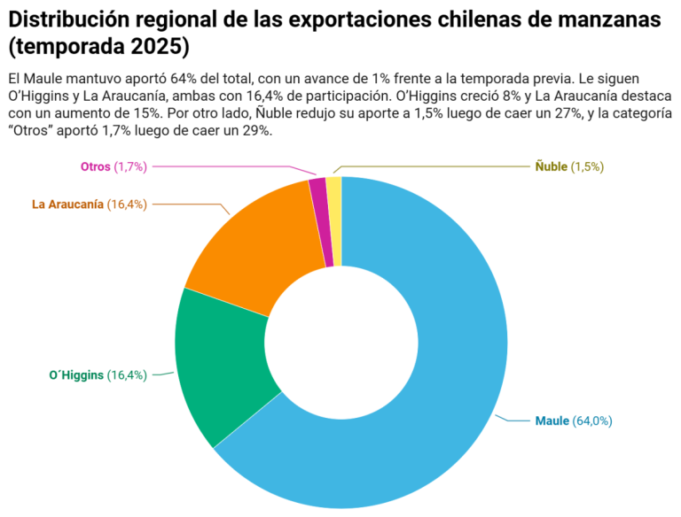 En el plano productivo interno, la Región del Maule mantuvo su posición como principal polo exportador, aportando casi dos tercios del total nacional y registrando un leve crecimiento frente a la temporada anterior. Más atrás se ubicaron O’Higgins y La Araucanía, con participaciones similares pero trayectorias distintas: mientras la primera mostró un avance moderado, la segunda destacó por un crecimiento de dos dígitos. En contraste, Ñuble redujo de forma significativa su presencia, al igual que el conjunto de otras regiones de menor escala.