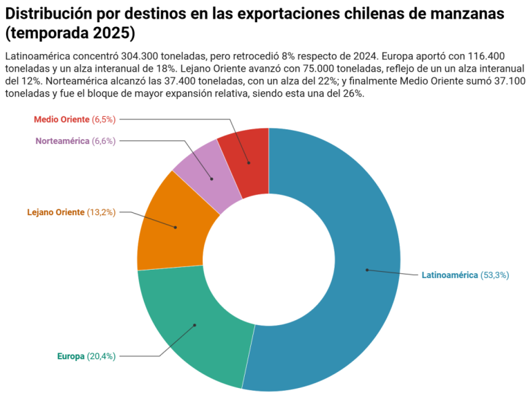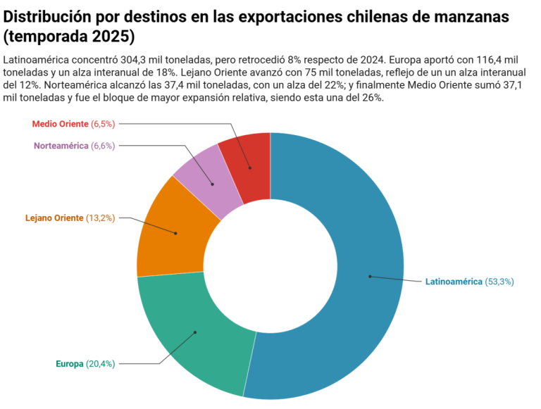 América Latina se mantuvo como el principal destino por volumen. Sin embargo, perdió participación frente al avance de Europa, Norteamérica y Medio Oriente. Con 570.119 toneladas exportadas, la temporada 2025 cerró con un crecimiento moderado y una reconfiguración del orden comercial de las manzanas chilenas.