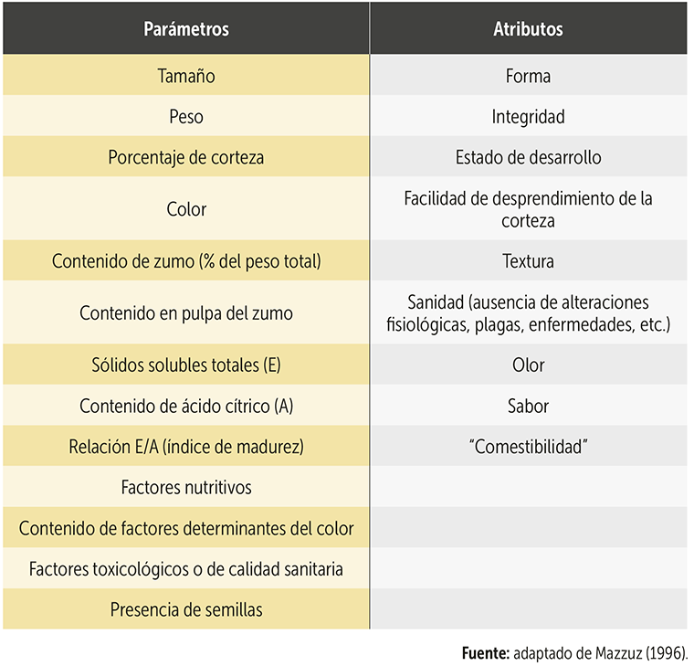Los programas de supermercados ya no los quieren, cosa que también ha afectado al mercado spot, impactando con severidad sobre el resultado comercial de la fruta de menor tamaño, la que ya ni siquiera vale la pena cosechar. Es en esta situación –cuando los volúmenes crecen y con ellos la presión sobre el precio– donde la palabra calidad cobra más fuerza, y son los frutos de mejor calidad aquellos que van a lograr el mayor retorno económico. Calidad es el conjunto de propiedades inherentes a una cosa, que permiten apreciarla como igual, mejor o peor que las restantes de su especie (Real Academia Española, 1992). En el caso de los cítricos, se puede definir la calidad como el resultado de dos grandes componentes; parámetros y atributos. Los primeros son aquellos fácilmente mensurables y cuantificables, mientras que los segundos son más difíciles de cuantificar (cuadro 1).