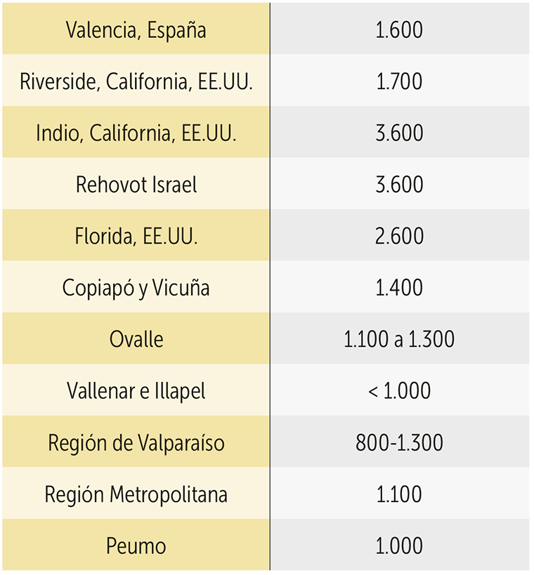 Factores externos Dentro de las variables exógenas se encuentran la pluviometría, temperatura y manejos culturales. En general con niveles pluviométricos más altos los calibres tienden a ser mayores que en regímenes de menores lluvias. A su vez la acumulación térmica (base 12,5°C) constituye un factor determinante en el calibre de los frutos. Por lo regular, zonas con mayores acumulaciones térmicas tienden a dar mejores calibres que áreas más limitantes, como Chile, donde la acumulación tiende a ser mucho menor que en otras regiones productoras de cítricos del mundo. Hablamos de un factor determinante no solo del tamaño de la fruta, sino también de otras variables de calidad, como la forma, el contenido de sólidos solubles y la coloración de la piel. Durante la temporada pasada (2020/21) en la mayoría de las localidades productoras de cítricos de nuestro país hubo una menor acumulación térmica, lo que redundó en curvas de calibre bastante inferiores a las de la temporada anterior (2019/20), donde la acumulación térmica había sido más alta que lo normal.