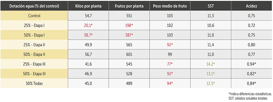 Ensayos de riego deficitario controlado que lleva actualmente GAMA, muestran en sus resultados preliminares que tanto reducciones del 25% o 50% del volumen de agua desde febrero a cosecha o del 10% y 20% en todo el año tienen impactos negativos en la productividad. Lo anterior nos llevó a probar en la zona de Panquehue un adicional de 15% y 28% más de agua respecto del control. Los resultados parciales son inicialmente positivos para el adicional de 15%. Una vez que todos los ensayos estén terminados, lo que corresponderá analizar es cuántos kilos/m3 produce cada uno de los tratamientos de calibres 4 y superiores (calibres comerciales), ya que eso es lo que realmente se debiese medir, no solo tonelaje total por m3 de agua.