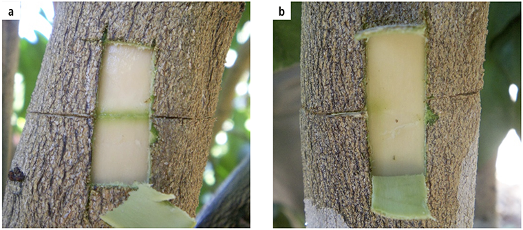 Rayado El rayado de ramas tiene un efecto variable sobre el calibre, dependiendo de la época en que se realice. Si el manejo se efectúa antes del final de la caída fisiológica, va a aumentar el cuajado y con ello va a inducir una reducción del calibre. Si se hace después del final de la caída fisiológica, va a ayudar a mejorar el calibre, y mientras más cercano al final de la caída, mayor será el efecto, pues aún existe algo de división celular en esa etapa que se ve beneficiada por efecto del rayado. En caso de realizar este manejo resulta importante hacer un constante chequeo de la intensidad con que se rayan las ramas, pues daños en el xilema pueden generar problemas de abastecimiento de agua y nutrientes a las hojas y con ello a los frutos.