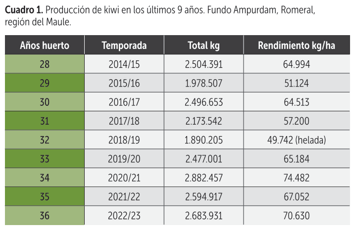 Los rendimientos que obtiene Jaime Berenguer en kiwi dejan con la boca abierta. En la cosecha de 2021 superó los 74.000 kilos por hectárea, la cifra más alta que ha alcanzado en su campo Ampurdam, comuna de Romeral, región del Maule (cuadro 1).
