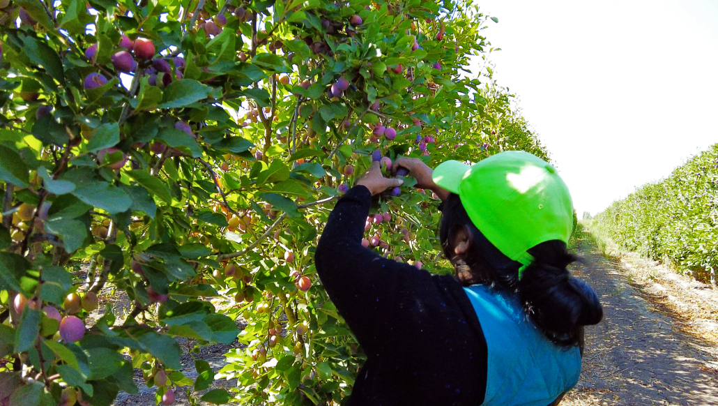 Cosecha mecanizada de ciruelos D’Agen en seto; al fondo en sistema tradicional. Campo San Miguel de Calleuque, Peralillo, región de O’Higgins.