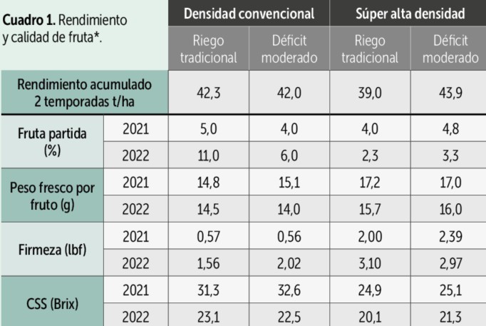 Independientemente de la madurez de cosecha, el sistema en súper alta densidad tuvo una mayor firmeza de fruta, característica asociada a un menor daño en la manipulación y mejor calidad para la comercialización en fresco.