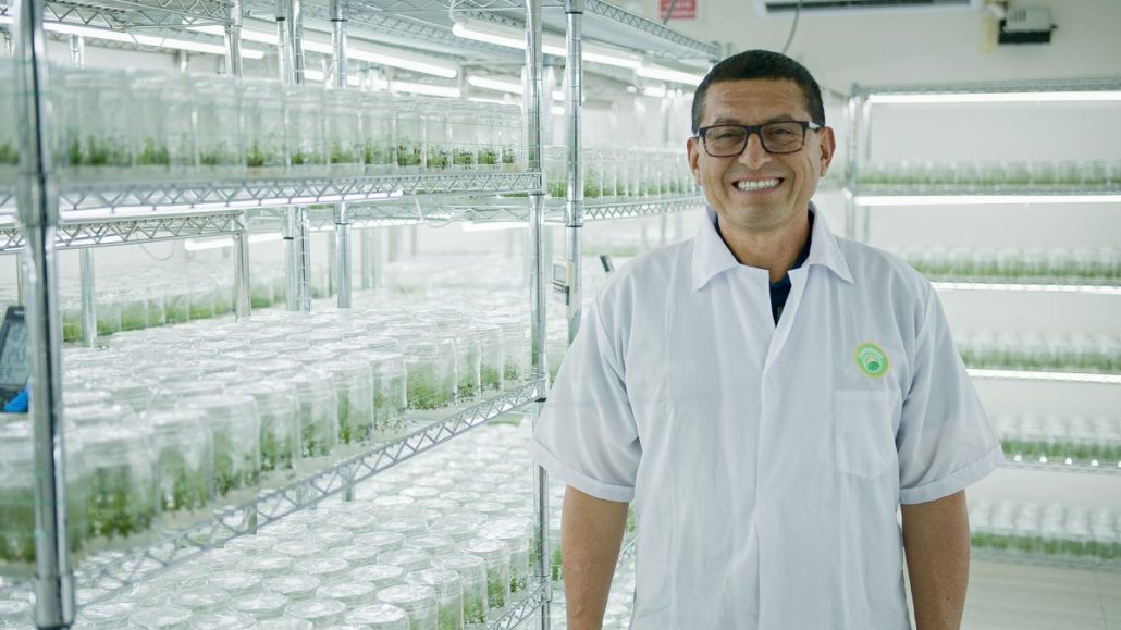 El laboratorio Biotech parece otro mundo. La luz blanca, el orden de los frascos, las estanterías llenas de plantines. Aquí, el tiempo parece ir a otra velocidad. Luis Tapia, gerente de desarrollo genético y viveros, camina entre las mesas de cultivo como quien pasea por un vivero personal. Aquí, Camposol desarrolla y multiplica sus variedades propias de arándano. “Aquí hacemos la multiplicación y clonación de nuestras plantas meristemáticas”, explica Luis Tapia. “Llevamos once años trabajando en esta área de la compañía, produciendo plantas in vitro, en este caso, de arándanos”.
