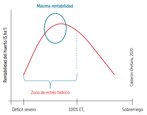 En primer lugar, si el objetivo es regar mejor para ser más rentable, resulta fundamental evitar el sobrerriego durante toda la temporada. Esta meta solo se puede cumplir a partir de la tecnificación de la gestión hídrica intrapredial. La determinación de la evapotranspiración de cultivo (ETc) usando la evapotranspiración de referencia (ET0) calculada con la ecuación de Penman-Monteith y los coeficientes de cultivo (KC) establece la línea base que no hay que cruzar. Aplicar más agua de lo que el huerto evapotranspira hacia la atmósfera significa ahogar la rentabilidad del negocio. Un requisito fundamental en la aplicación de esta tecnología es tener correctamente establecidas, mantenidas y calibradas las estaciones meteorológicas para calcular la ET0. Al decir correctamente establecidas, se descartan inmediatamente todas aquellas que están dentro de huertos frutales, al lado de casetas de seguridad, oficinas, bodegas, bosques, caminos y canales de regadío, pues el modelo FAO Penman-Monteith estima la ET de una superficie cultivada con especies de pradera. Por ende, la estación de ET0 debe estar ubicada en una pradera sembrada con un cultivo de referencia de no más de 12 cm de altura, sin sombra durante los 365 días del año, y en óptimas condiciones de manejo agronómico, entre otras consideraciones (Zotarelli et al., 2010). Este approach resulta bastante simple de aplicar, siempre y cuando se cuente con suficiente agua de riego, pero ¿qué pasa si al agua no está disponible?