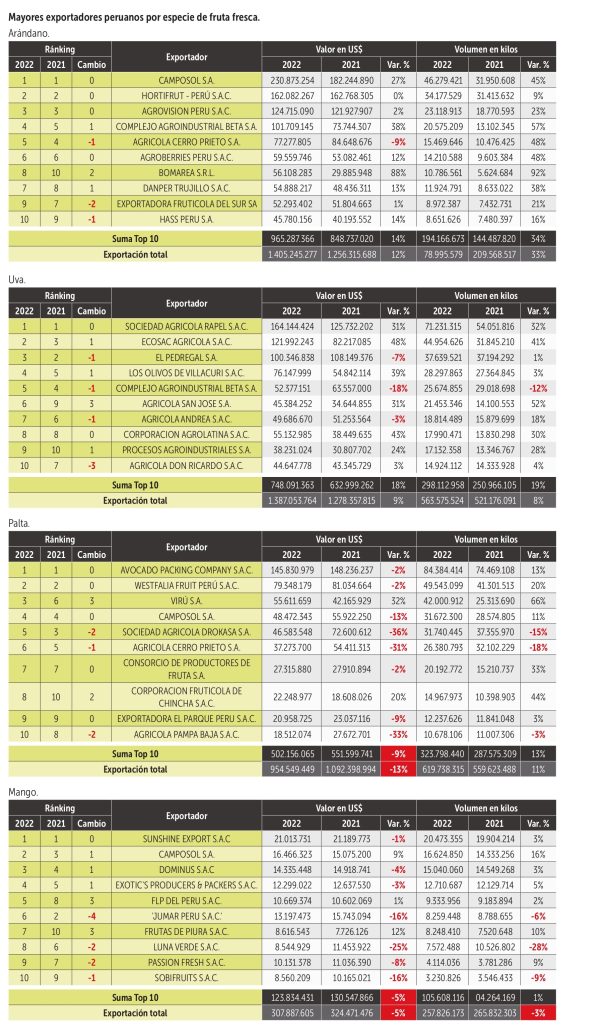 El crecimiento de 2022 fue muy distinto de acuerdo al tipo de fruta exportada. De hecho, el arándano pasó a ser la fruta con mayor valor exportado, al subir 12% y llegar a los US$ 1.405 millones. Este incremento se dio gracias a una expansión de 33% en los volúmenes, contrarrestando así la caída de precios. Camposol, Hortifrut y Agrovision mantuvieron los tres primeros lugares en volúmenes exportados de esta fruta. Con este crecimiento, el valor exportado del arándano pasó por poco a la uva como principal exportación, debido a que esta creció solo 9%, llegando a US$ 1.387 millones. Esto pese a que los volúmenes de la uva duplican a los del arándano. Rapel, Ecosac y El Pedregal se mantuvieron en el podio de los tres principales exportadores de esta especie. Si se trata de volúmenes, la palta sigue dominando en Perú: el fruto generó envíos por casi 620 millones de kilos en 2021, al aumentar en 11% las cajas enviadas. No obstante, los bajos precios del año pasado impidieron que los valores de la palta subieran: estos cayeron en 13%, hasta US$ 954 millones. Los principales representantes de este sector son Avocado Packing Company, Westfalia Fruit y Virú. Esta última destacó por su fuerte crecimiento, al subir 32% en valores y 66% en volúmenes. Después de estas tres frutas que rondan los US$ 1.000 millones de exportaciones le sigue con cierta distancia el mango: este sumó US$ 307 millones en valor exportado en 2022 (caída de -5%) y 258 millones de kilos en volúmenes (-3%). Con US$ 228 millones (+3%) le sigue la mandarina. El banano, con US$ 122 millones, tras caer -19% es la única otra fruta fresca que supera los US$ 100 millones.