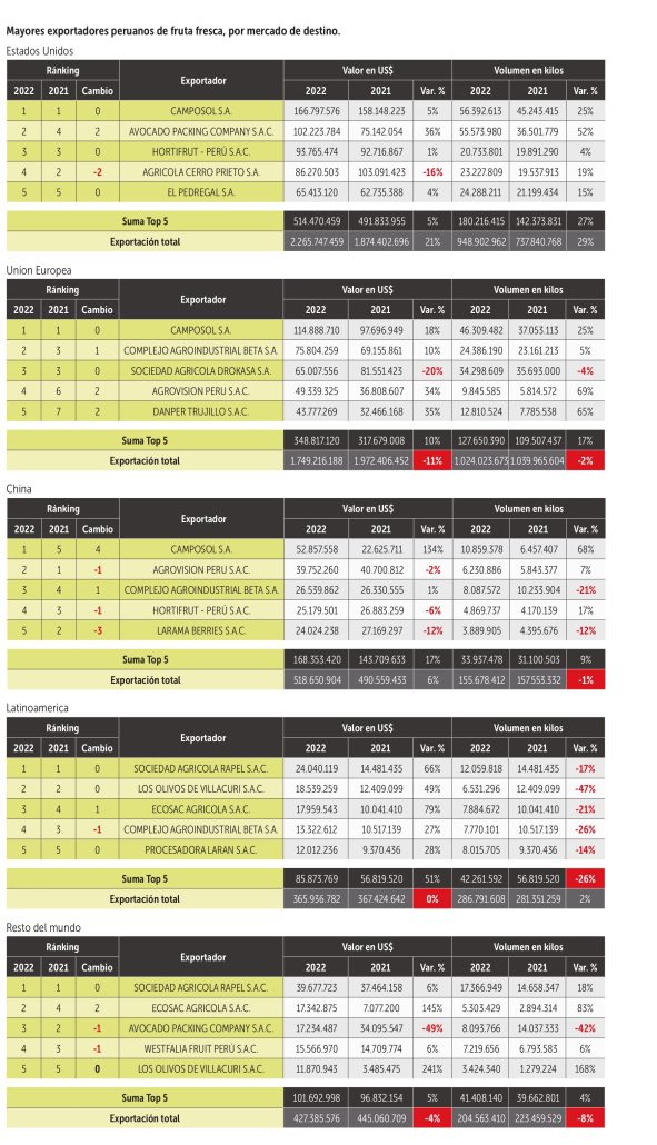 En el análisis por mercados de destinos, también hubo cambios en el ránking de importancia. Estados Unidos pasó al primer lugar al recibir US$ 2.265 millones en fruta fresca peruana tras crecer 21%. Camposol, Avocado Packing Company y Hortifrut lideran los envíos a este país. Con su crecimiento, Estados Unidos superó a la Unión Europea que bajó -11% en la recepción de fruta fresca peruana, al llegar a US$ 1.749 millones. Camposol, Complejo Industrial Beta y Sociedad Agrícola Drokasa encabezan los envíos al viejo continente. Con bastante distancia sigue China, el cual creció solo 6% este año, totalizando US$ 518,6 millones. Camposol, Agrovision y Complejo Industrial Beta son los mayores exportadores a ese mercado. Crecimiento cero fue el que tuvieron los envíos de fruta fresca a América Latina, donde se llegó a US$ 366 millones. Sociedad Agrícola Rapel, Los Olivos de Villacuri y Ecosac Agrícola fueron los mayores jugadores en estos mercados. El resto del mundo no parece tener el mejor desempeño. Los envíos a otros mercados sumaron US$ 427 millones en 2022, tras caer en -4%. Avocado Packing, Camposol y Agrícola San José son los principales jugadores peruanos en estos mercados.