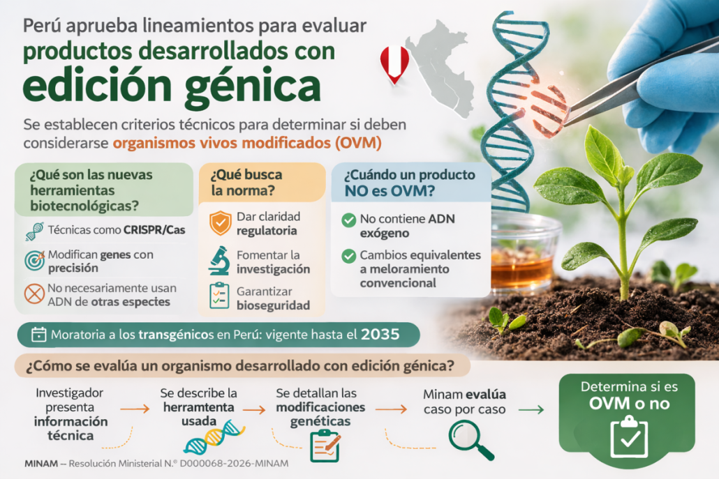 El Ministerio del Ambiente (Minam) aprobó los lineamientos para determinar la condición de organismos vivos modificados (OVM) en productos u organismos desarrollados mediante nuevas herramientas biotecnológicas. La medida fue oficializada mediante la Resolución Ministerial N.° D000068-2026-MINAM y establece criterios técnicos y científicos que permitirán evaluar estos desarrollos caso por caso dentro del marco regulatorio vigente.