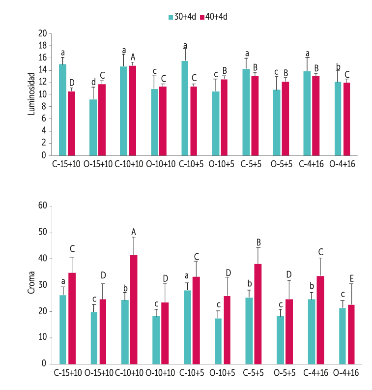 Color de la piel: En general, los frutos C mantuvieron desde el inicio y durante todo el almacenamiento, mayores valores de luminosidad (L*), croma (C*) y tono (H°), en comparación con los frutos O. Después de 30+4 días, el tratamiento O- 4 + 16 mostró los mayores valores de luminosidad (12) y tono (20.5°), siendo 30 y 15% mayores con respecto al resto de los tratamientos. Tras 40+4 días, el tratamiento O- 10 + 10 registró los valores más altos para L* (14,7), C* (41,4) y H° (28,2°), y los menores fueron en O- 15 + 10 para luminosidad (10,5), O- 4 + 16 para croma (22,7), y O- 10 + 10 (19,9°) junto con O- 4 + 16 (20,9°) para tono (Figura 1). Los resultados muestran que después de un almacenamiento prolongado, la combinación de un estado de madurez C con concentraciones de gases sobre 10% CO2 y 10 % O2, pueden mantener un color más atractivo, un atributo clave para el mercado de exportación.