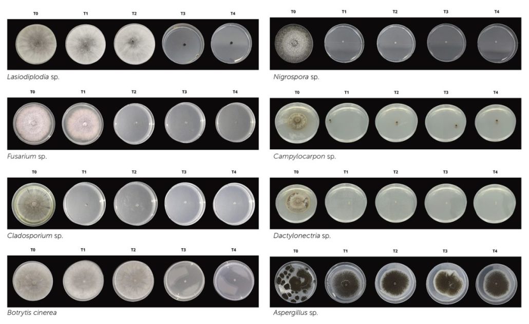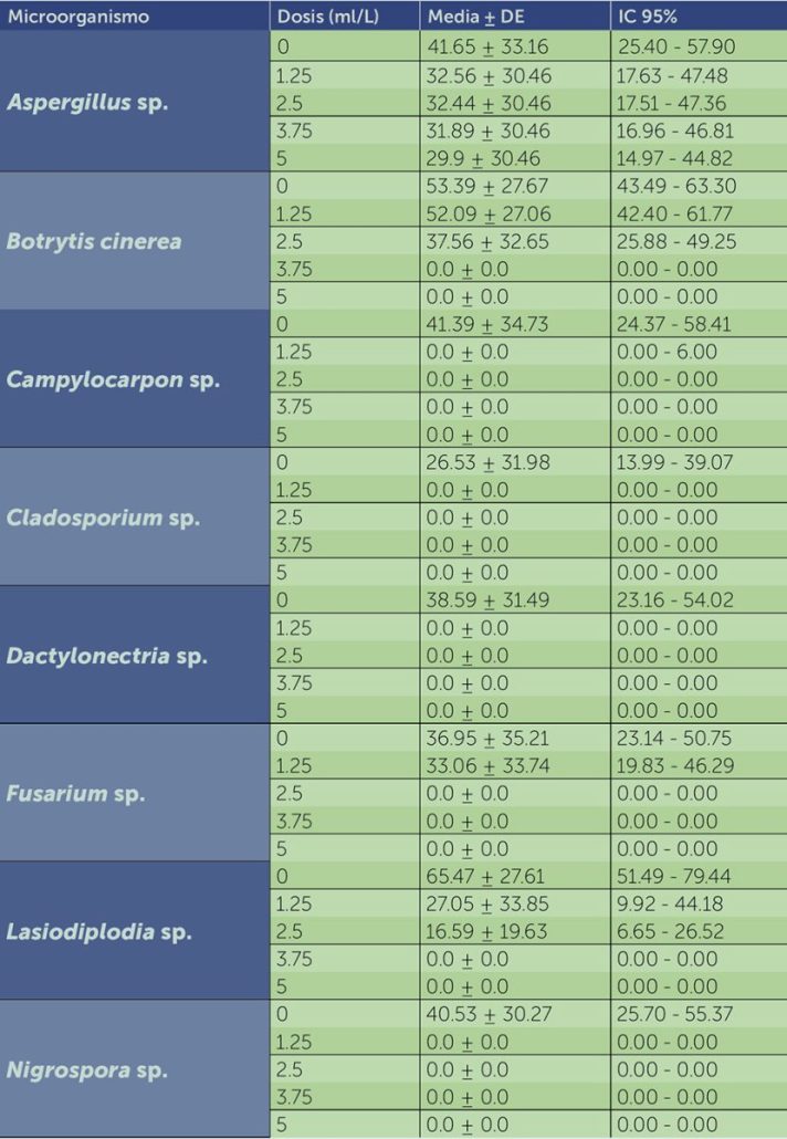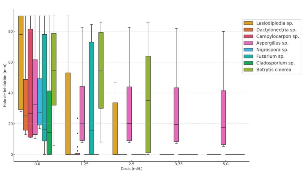 En microorganismos como Lasiodiplodia sp., Botrytis cinerea y Fusarium sp., que son conocidos por su papel relevante en pudriciones post cosecha, se observó una inhibición significativa incluso a concentraciones intermedias. Por otro lado, Aspergillus sp. no mostró diferencias significativas entre las dosis, lo que podría atribuirse a una mayor tolerancia (Figura 1). Además, el hecho de que algunas especies como Nigrospora sp. y Cladosporium sp. respondieran significativamente a dosis más bajas indica, optimizando así la relación costo-beneficio y reduciendo el impacto ambiental.